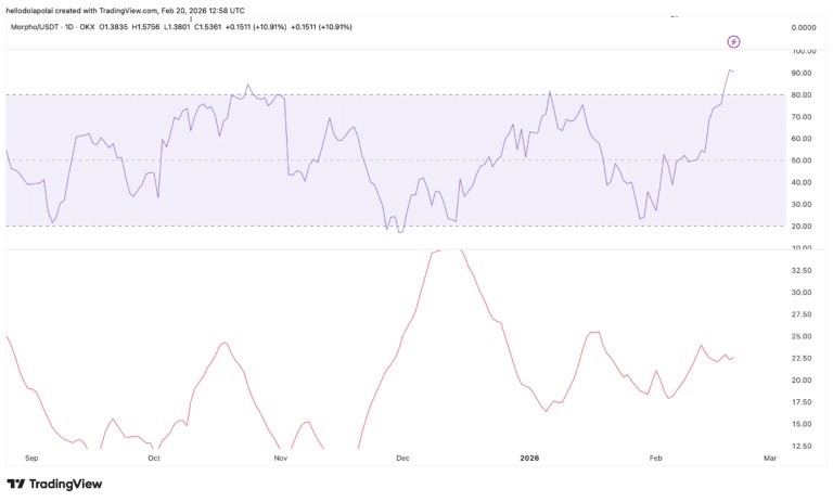 上涨势头正在增强。资金流量指数 (MFI)显示大量资金流入 MORPHO,推动该资产进入超买区