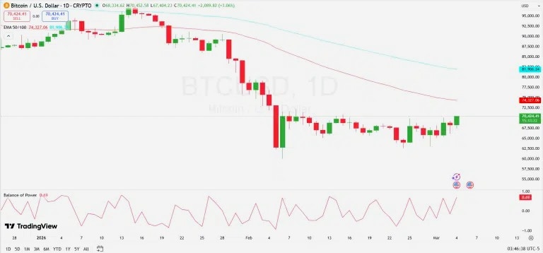 The daily chart shows Bitcoin attempting to reverse after a sharp correction that pushed the price briefly toward the $60,000–$62,000 region. Recent candles indicate a gradual recovery phase, with BTC preparing to test the $70,000 area, suggesting improving short-term momentum. The Balance of Power indicator near 0.69 also signals that buyers currently hold a slight advantage, supporting the ongoing rebound.