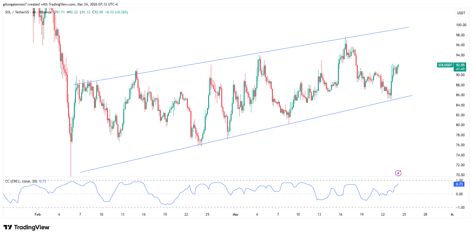 Harga SOL telah diperdagangkan di dalam channel ini sejak Februari, dengan target sekarang di $100 atau lebih tinggi. Tapi breakout bergantung pada bertahan di atas $90, yang sudah di-retest.