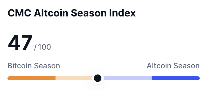 Namun bagi bagiannya, Indeks Musim Altcoin, dengan pembacaan waktu tekan 47, perlu mencapai 75 untuk mengonfirmasi musim altcoin penuh.