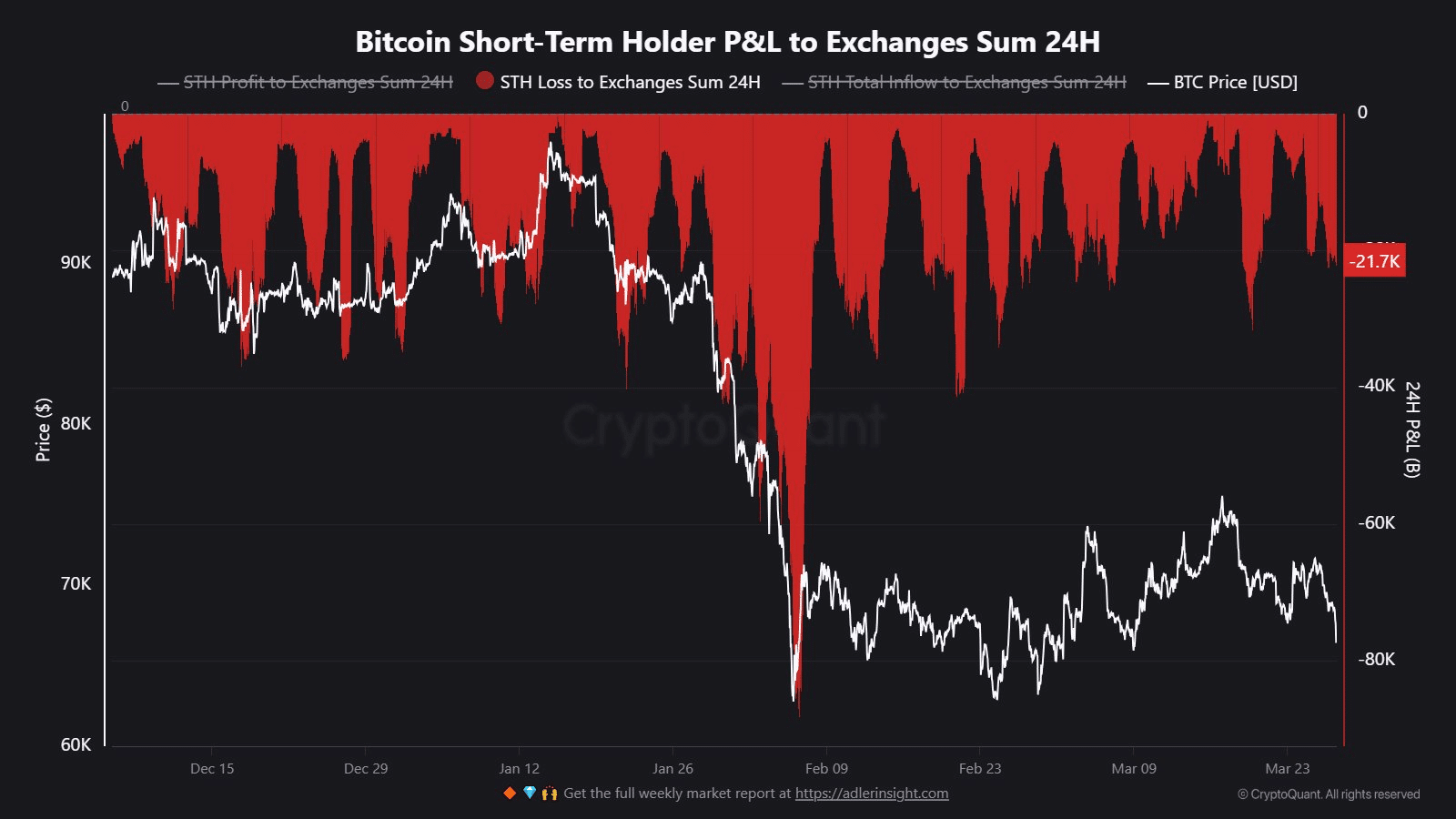 Seperti yang disorot grafik di atas, sekitar 21.700 BTC dari pemegang jangka pendek mengalir ke bursa dalam 24 jam terakhir, semua dijual dengan kerugian, mengarah pada peningkatan tekanan jual yang didorong kepanikan. Dipasangkan dengan tawaran institusional yang lemah, ini menunjukkan bahwa koreksi kripto saat ini lebih dari sekadar penarikan rutin.