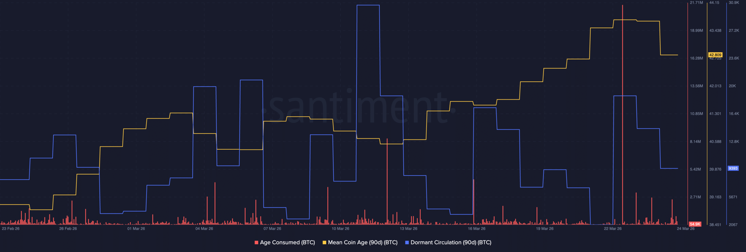 Metrik seperti Usia Rata-Rata Koin, Usia Dikonsumsi, dan Sirkulasi Tidak Aktif semua menunjukkan bahwa sementara sebagian besar koin terus menua di dompet, ada lonjakan sesekali. Selama waktu yang sama, koin yang lebih lama sempat bergerak, khususnya pada awal, pertengahan, dan akhir Maret.
