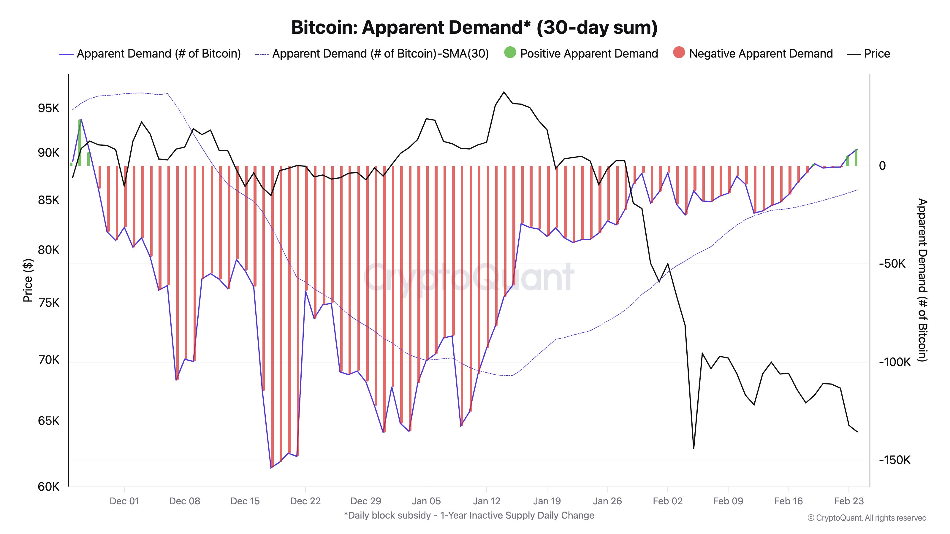 Permintaan Nyata tetap pada level negatif kecil untuk sebagian besar Februari, tetapi baru-baru ini, pembalikan ke wilayah positif akhirnya terjadi. "Permintaan spot Bitcoin tumbuh untuk pertama kalinya sejak akhir November," catat analis. Untuk saat ini, level hijau metrik masih relatif kecil, jadi tinggal menunggu apakah itu akan naik lebih jauh dalam waktu dekat.