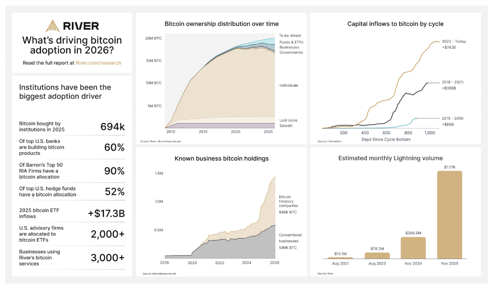 Di bawah permukaan, adopsi Bitcoin di berbagai institusi, pemerintah, bank, dan pedagang biasa telah tumbuh dengan kecepatan yang oleh perusahaan digambarkan sebagai bersejarah — dan yang belum sepenuhnya terlihat dalam harga, kata River.
