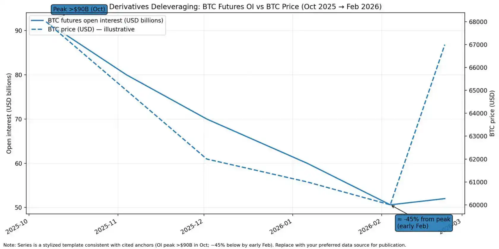Open interest futures Bitcoin turun sekitar 45% dari puncaknya lebih dari $90 miliar pada Oktober 2025, ke level awal Februari 2026, sementara harga Bitcoin turun dari sekitar $68.000 mendekati $60.000, sebelum rebound ke sekitar $67.000