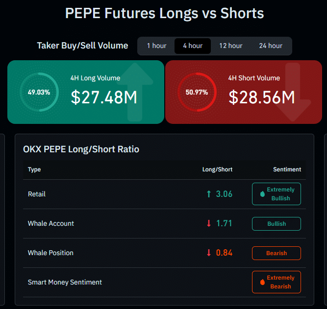 Pada grafik harga, PEPE turun sekitar 10% dalam 24 jam terakhir. Bahkan, segera setelah pembaruan ETF Canary, memecoin tersebut merosot 4,5%.
