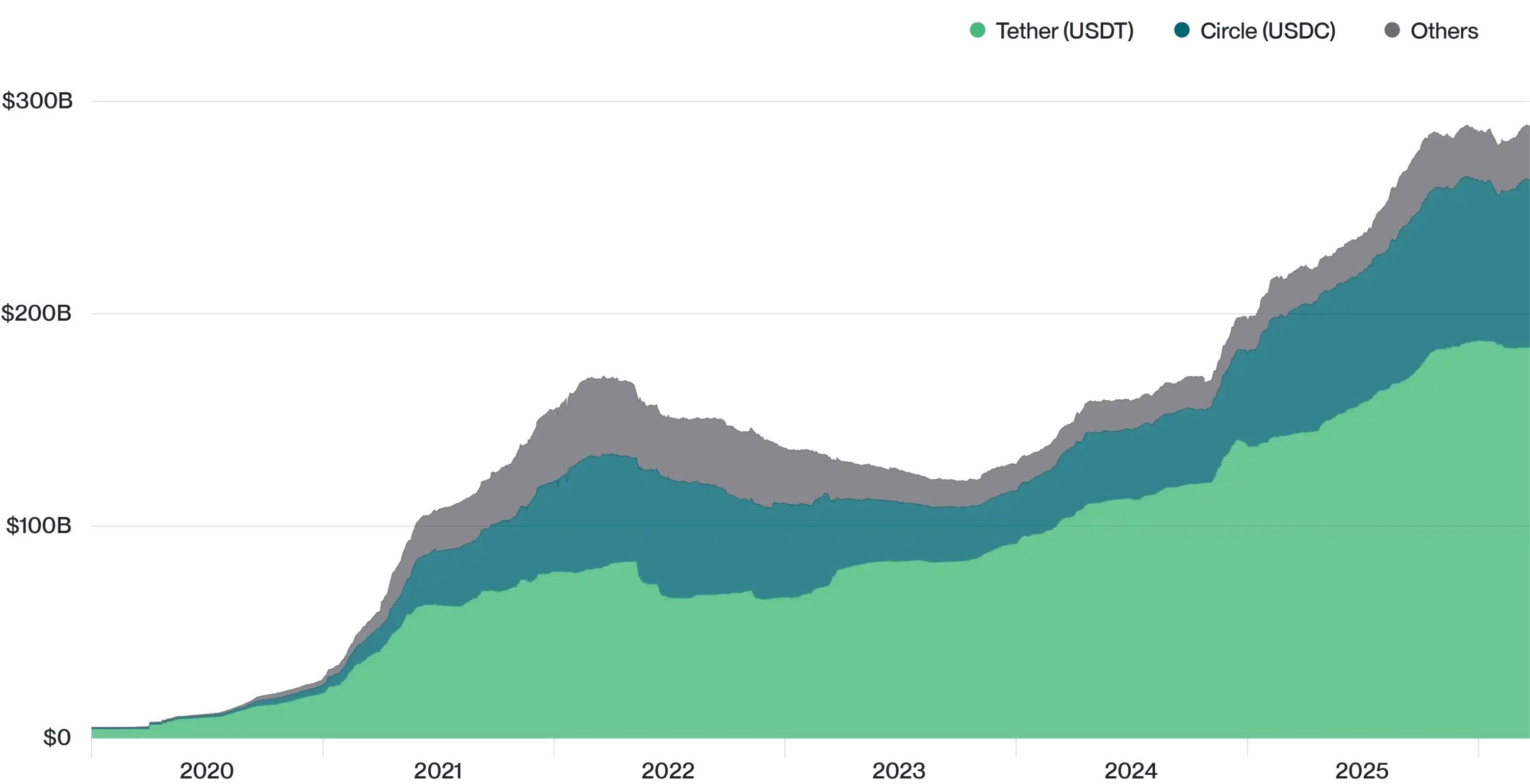Sumber: Bitwise Asset Management, data dari The Block. Periode data: 1 Januari 2020 hingga 23 Maret 2026. Catatan: 'Lainnya' termasuk BUSD, crvUSD, DAI, FDUSD, FEI, FRAX, GHO, GUSD, LUSD, MIM, PYUSD, TUSD, USDD, USDe, USDP, dan USDS.