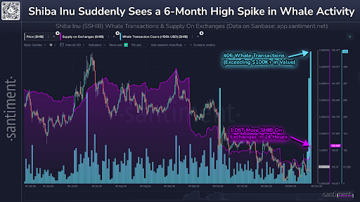 Shiba Inu juga menunjukkan tanda-tanda aktivitas yang diperbarui dalam hal transaksi on-chain. Menurut data terbaru dan bagan yang dibagikan oleh SanSights di Santiment, aktivitas paus SHIB telah meroket ke level tertinggi sejak awal Juni 2025. Dalam satu hari terakhir atau lebih, beberapa akun dilaporkan melakukan 406 transaksi, masing-masing memindahkan lebih dari $100.000 dalam SHIB.