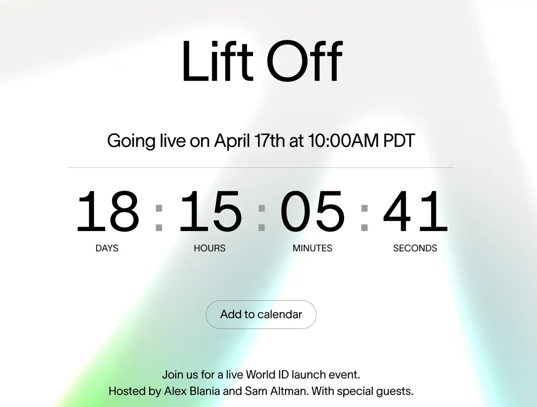 Pada 17 April, World akan menyelenggarakan peluncuran global "Lift Off" World ID di San Francisco, dengan Sam Altman hadir secara pribadi dan bersama-sama memimpin acara dengan CEO world, Alex.