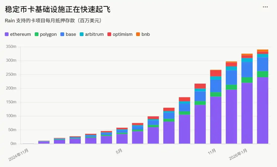 Setoran jaminan bulanan untuk proyek kartu stablecoin yang didukung Rain (termasuk Etherfi Cash, Kast, Wallbit, dll.) telah tumbuh dari hampir nol pada November 2024 menjadi lebih dari $300 juta per bulan pada awal 2026. Meskipun ini adalah jaminan yang mendukung konsumsi, bukan konsumsi langsung stablecoin, lintasannya sangat mencolok: aktivitas bisnis stablecoin sedang bangkit.