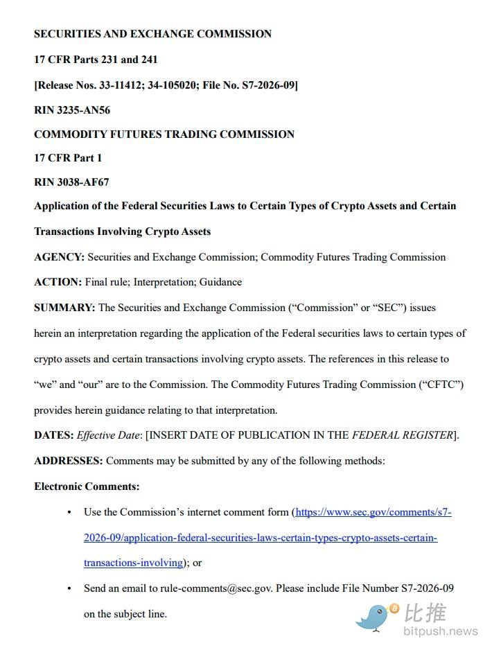 17 Maret 2026, Komisi Sekuritas dan Bursa AS (SEC) bersama Komisi Perdagangan Berjangka Komoditas AS (CFTC) merilis dokumen interpretatif bernomor 33-11412. Kerangka regulasi sepanjang 68 halaman ini secara resmi menandakan: regulasi kripto AS meninggalkan era "regulasi melalui penegakan hukum" yang berlangsung selama satu dekade, dan memasuki era baru kejelasan dan harmonisasi yang digerakkan oleh "Project Crypto".