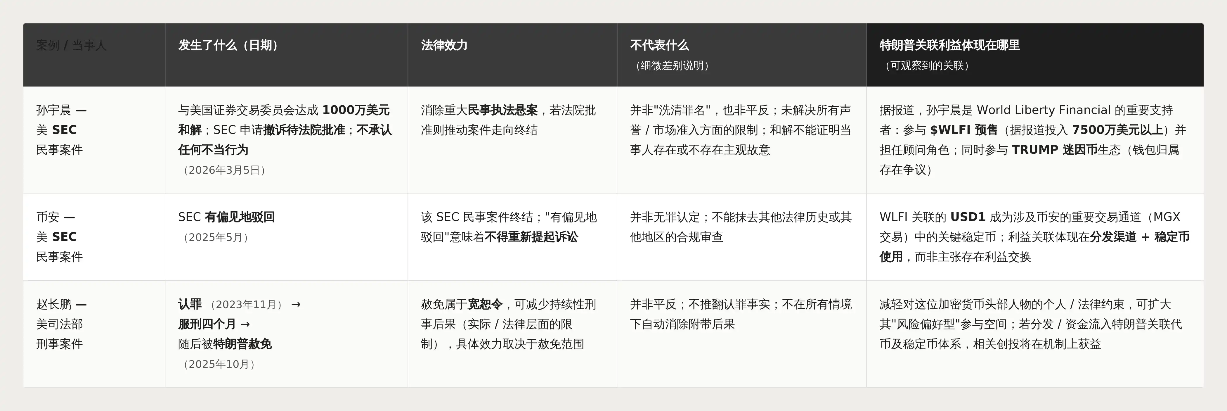 Trump tidak perlu secara pribadi mengarahkan hasil regulasi untuk menjadi penerima manfaat pribadi terbesarnya. Tumpang tindih ini bersifat mekanis: ketika tekanan hukum pada pelaku yang mengendalikan saluran distribusi dicabut—seperti kemampuan pertukaran Binance untuk mendaftarkan aset, atau kemampuan investasi Justin Sun—proyek-proyek yang menangkap pelaku yang kembali aktif mengambil manfaat, dan struktur token dan stablecoin World Liberty kebetulan berada di node kunci ini.