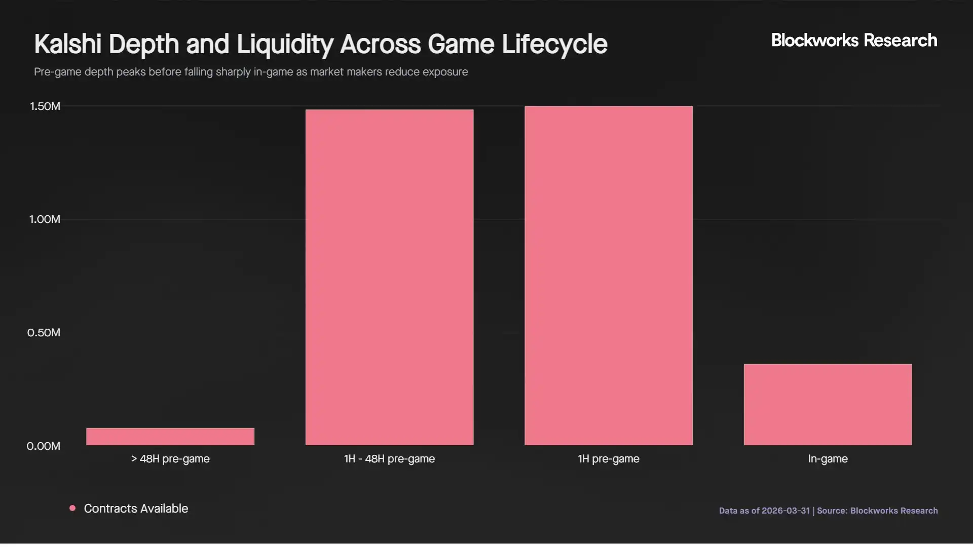 Bagi peserta institusional yang mengalokasikan $5.000 atau lebih per posisi, kemampuan eksekusi selama pertandingan terbatas, karena pesanan akan mempengaruhi harga atau harus disebar ke beberapa pasar. Oleh karena itu, bagi trader yang lebih besar, jendela eksekusi terbaik adalah 48 jam hingga 1 jam sebelum pertandingan, ketika kedalaman kontrak lebih dari 4 kali lipat dibandingkan selama pertandingan dan spread masih tetap kecil.