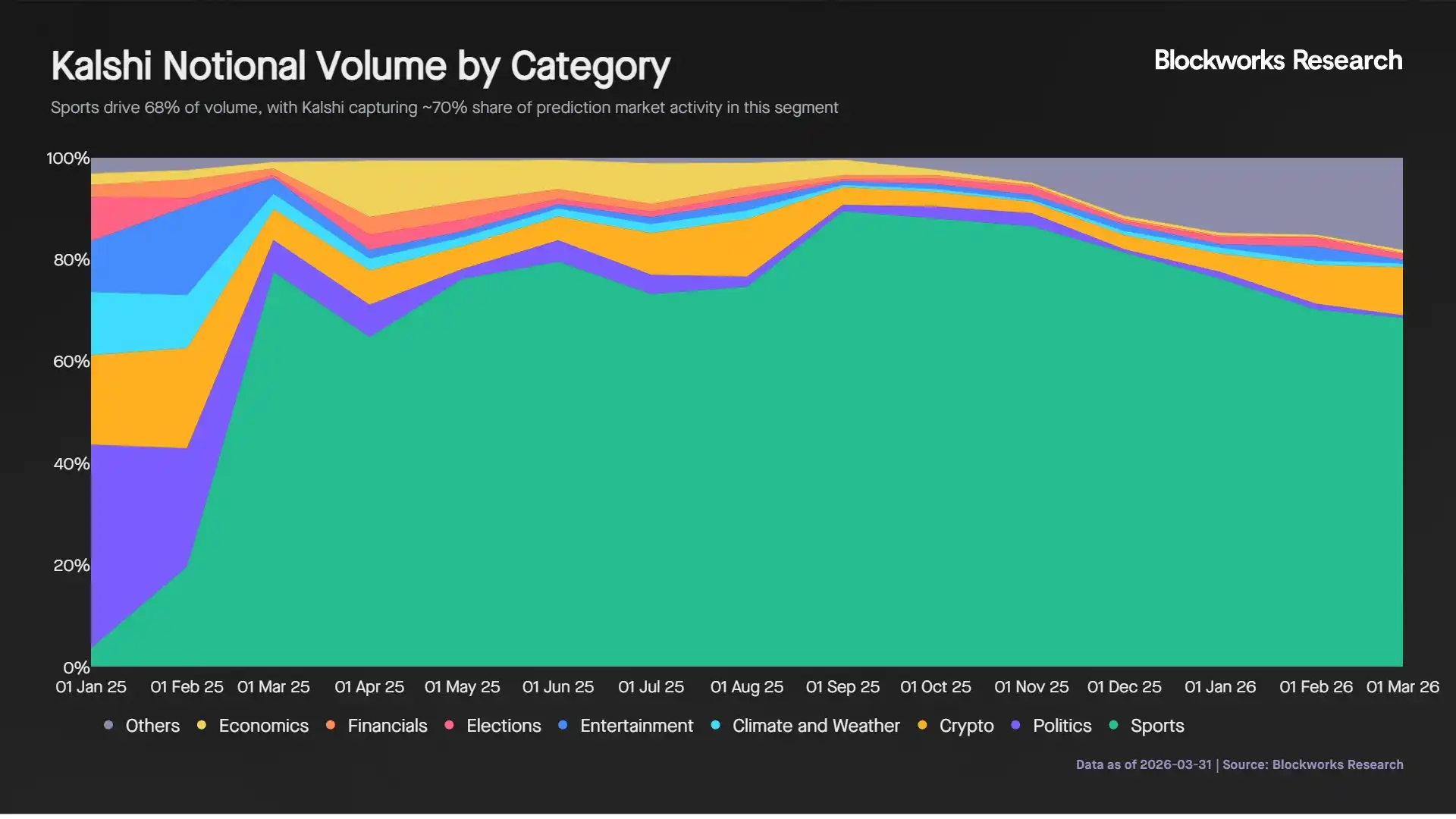 Pasar olahraga telah menjadi pendorong utama pertumbuhan ini, saat ini menyumbang 68% dari total volume perdagangan. Volume perdagangan di bidang olahraga meningkat dari $540 juta pada Juli 2025 menjadi $9,9 miliar pada Maret 2026, tumbuh 18 kali lipat dalam tiga kuartal.Kalshi memegang posisi yang kuat di bidang ini, mencakup sekitar 70% dari volume perdagangan pasar prediksi olahraga.