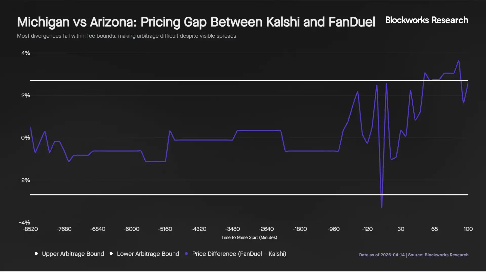 Pada kenyataannya, perbedaan harga hanya sedikit menutupi biaya ini. Median perbedaan harga selama pertandingan adalah 2,59%, dengan 8 dari 20 periode lima menit (40%) melebihi ambang batas biaya. Meskipun pada babak kedua, perbedaan harga mencapai 3,64% karena FanDuel lebih lambat dalam menyesuaikan harga terhadap keunggulan Michigan yang semakin besar, peluang ini tidak berlangsung cukup lama untuk mendukung strategi arbitrase yang andal. Selain itu, likuiditas intra-pertandingan yang terbatas di Kalshi lebih membatasi realisasi arbitrase ukuran efektif.