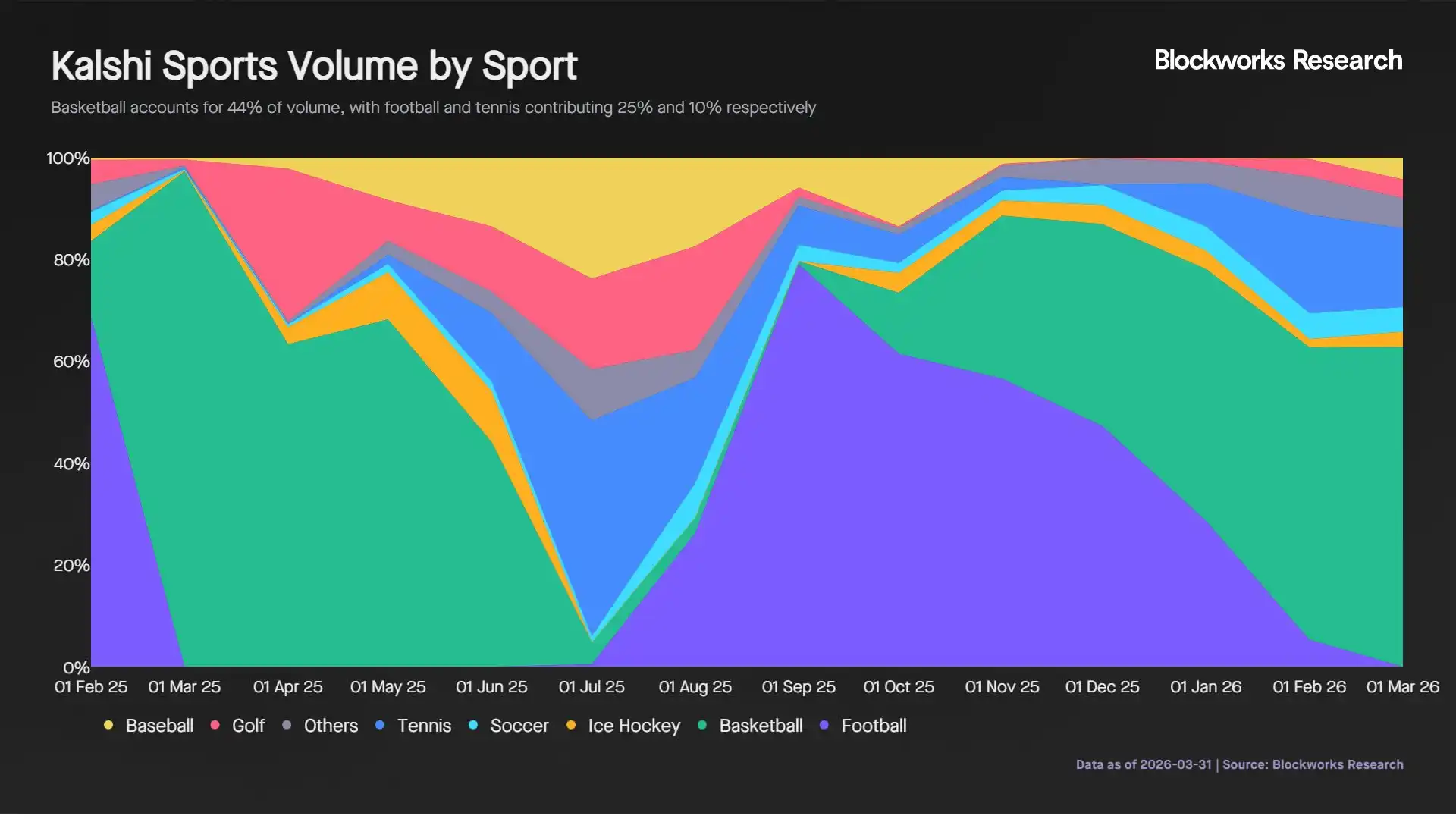 Dalam perdagangan olahraga, volume perdagangan dipengaruhi secara signifikan oleh musim dan didorong oleh acara-acara besar. Bola basket menyumbang 44% dari volume perdagangan olahraga, diikuti oleh sepak bola Amerika (28%) dan tenis (10%). Sepak bola Amerika mendorong lonjakan volume perdagangan yang tajam antara Agustus dan September 2025, dari $640 juta menjadi $2,6 miliar, tetapi menurun setelah Super Bowl.