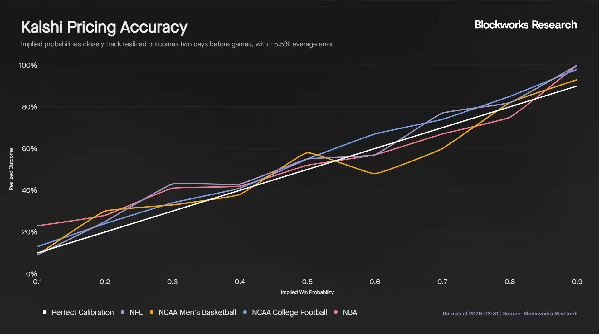 Dua hari sebelum pertandingan dimulai, harga Kalshi adalah indikator yang kuat untuk memprediksi hasil pertandingan. Rata-rata, probabilitas tersirat menyimpang dari hasil aktual sebesar 5,5 poin persentase. Di antara empat liga yang dianalisis, sepak bola perguruan tinggi NCAA memiliki akurasi prediksi tertinggi.