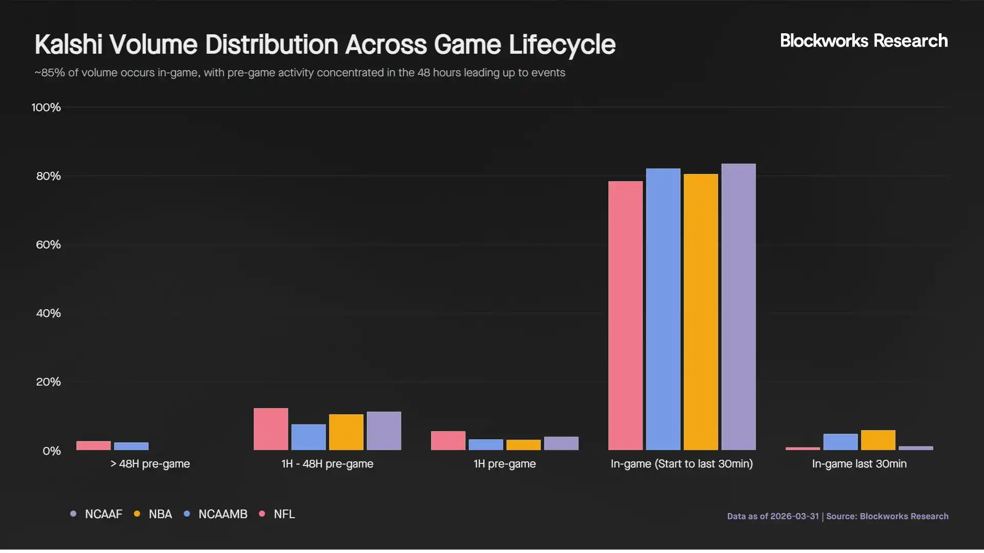 Sejak Oktober, acara bola basket terus memimpin volume perdagangan, dengan Kejuaraan Bola Basket Pria NCAA (National Collegiate Athletic Association) yang baru-baru ini diselenggarakan mencatat volume perdagangan aktual $1,5 miliar dan volume perdagangan nominal $3,3 miliar. Ini setara dengan perkiraan $3,3 miliar yang dipertaruhkan oleh orang Amerika selama "March Madness" 2026, menyoroti peran penting yang semakin meningkat dari pasar prediksi.