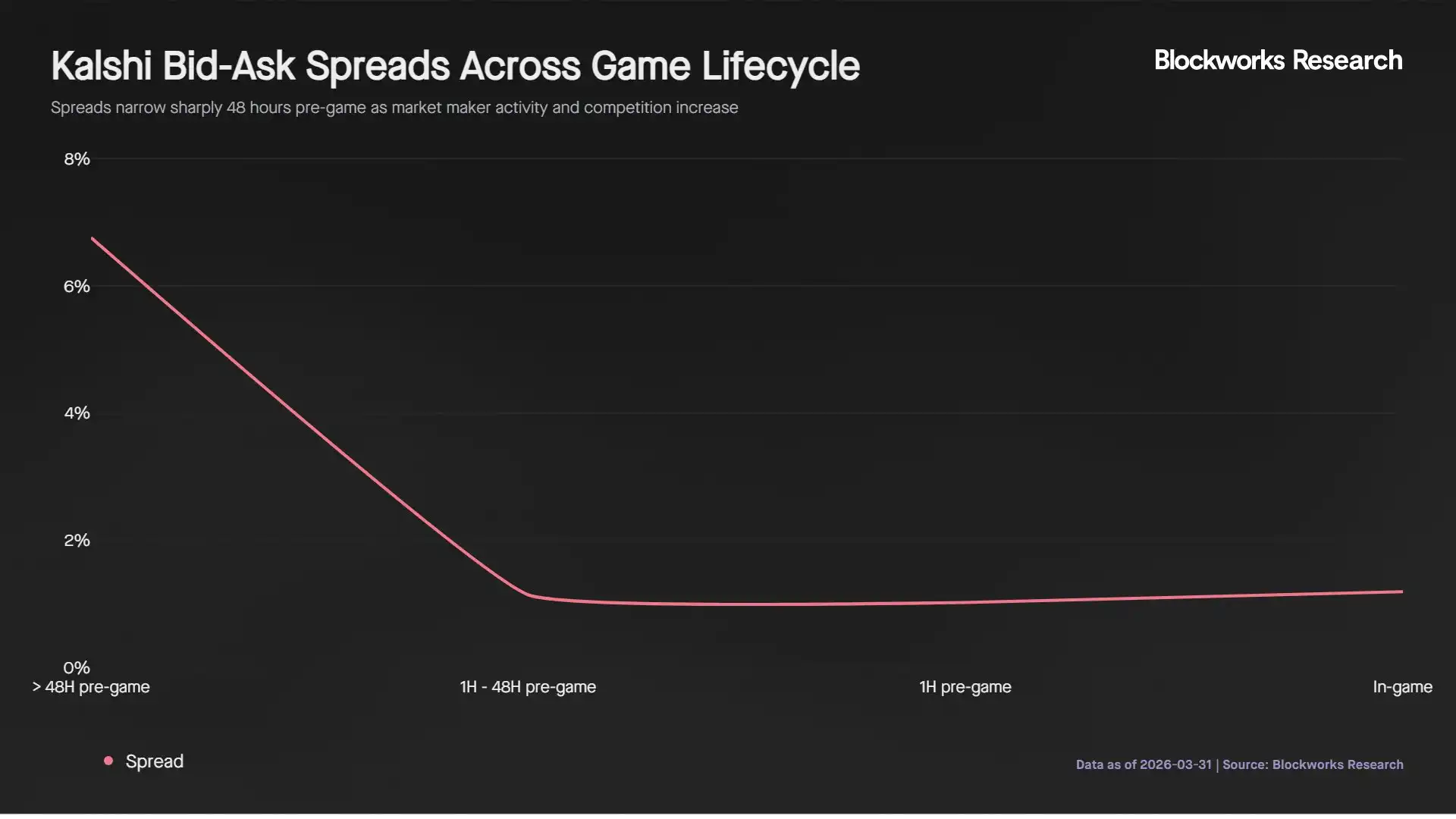 Dalam jendela 48 jam pra-pertandingan, kedalaman pasar meningkat 19 kali lipat seiring dengan volume. Namun, selama pertandingan berlangsung, meskipun aktivitas perdagangan lebih sering, kedalaman menurun 76%. Ini menunjukkan bahwa market maker mengurangi ukuran pesanan yang ditempatkan sambil mempertahankan spread yang ketat, kemungkinan besar untuk mengelola risiko adverse selection yang mereka hadapi ketika probabilitas diperbarui dengan cepat selama pertandingan real-time.