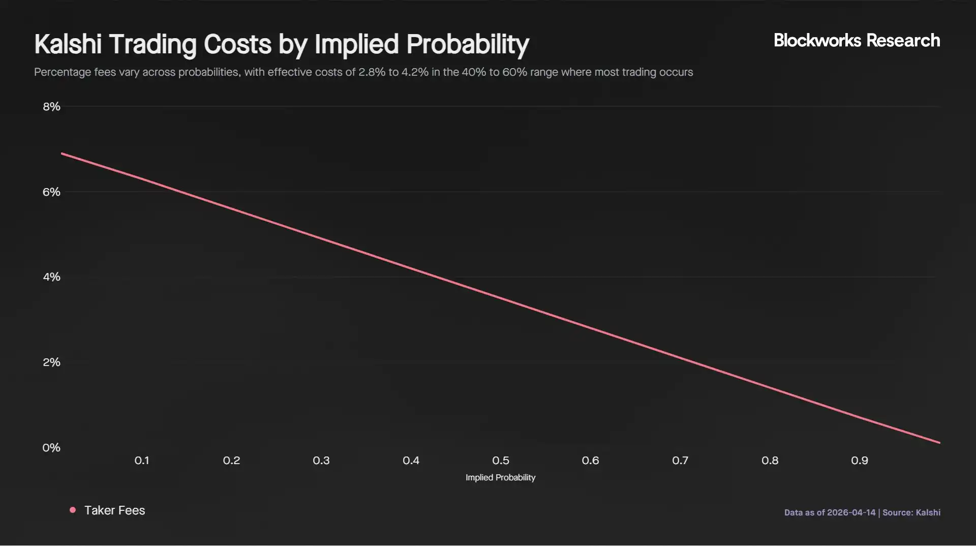 Odds FanDuel sudah termasuk komisi, yang setara dengan biaya masuk sekitar 2% per sisi. Di platform Kalshi, biaya bervariasi berdasarkan probabilitas kontrak, dengan nilai absolut tertinggi di sekitar probabilitas 50%, menghasilkan biaya sekitar 3,50% untuk pembuat (taker) dan sekitar 0,88% untuk penempat (maker). Karena sebagian besar perdagangan intra-pertandingan terjadi dalam kisaran probabilitas 40% hingga 60%,biaya perdagangan aktual di platform Kalshi berkisar antara 2,8% hingga 4,2%, yang sebanding atau bahkan lebih tinggi dalam beberapa kasus dibandingkan dengan platform taruhan olahraga tradisional, terutama untuk taker.