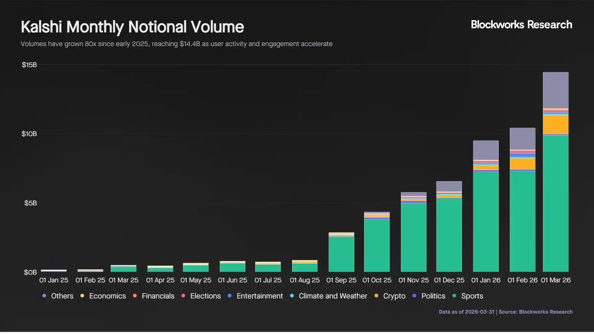 Kalshi mengalami pertumbuhan pesat dalam setahun terakhir, dengan total volume perdagangan nominal bulanan meningkat 80 kali lipat dari $180 juta pada awal 2025 menjadi $14,4 miliar pada Maret 2026. Tingkat pertumbuhan volume perdagangan bulanan rata-rata mencapai 40%, mencerminkan peningkatan keterlibatan pengguna dan aktivitas perdagangan.
