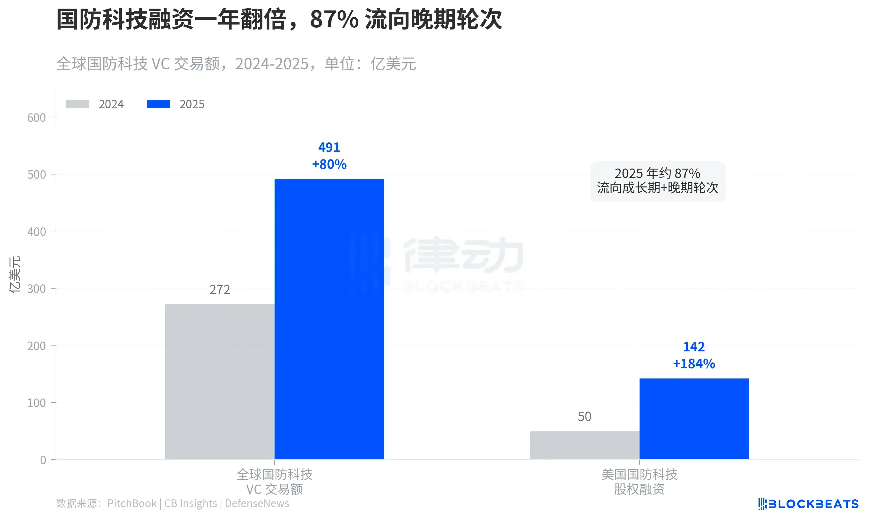 Menurut data PitchBook, nilai transaksi modal ventura teknologi pertahanan global pada tahun 2025 mencapai $49,1 miliar, hampir dua kali lipat dari $27,2 miliar pada tahun 2024. Menurut DefenseNews, pendanaan ekuitas teknologi pertahanan domestik AS melonjak dari $5 miliar pada tahun 2024 menjadi $14,2 miliar, peningkatan hampir 3 kali lipat. Sekitar 87% dari modal tersebut mengalir ke putaran tahap pertumbuhan dan akhir. Dana tidak lagi dialirkan ke prototipe eksperimental, tetapi ke perusahaan yang bersiap untuk produksi massal dan pengiriman. Menurut perkiraan JPMorgan, sejak 2021, teknologi pertahanan global telah menyerap sekitar $130 miliar dalam modal ventura.