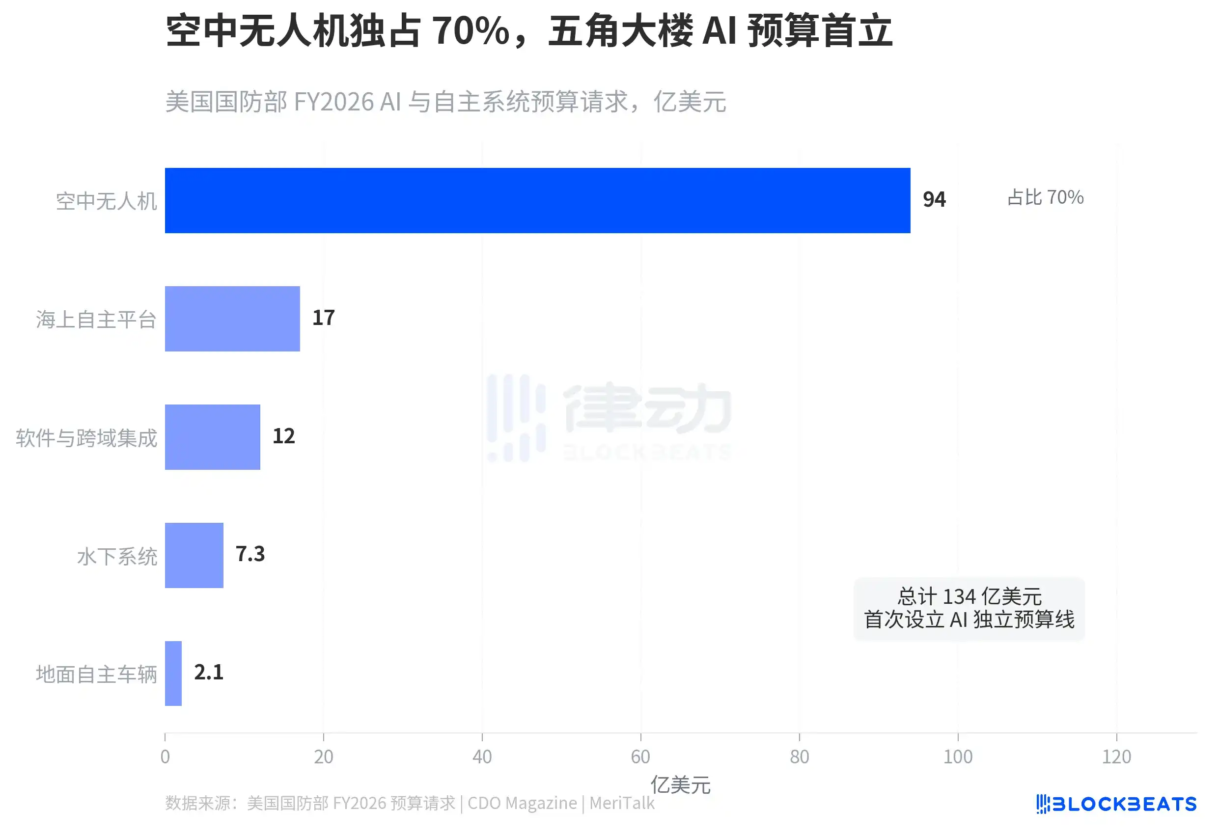 Menurut permintaan anggaran FY2026 Departemen Pertahanan AS, Pentagon untuk pertama kalinya membuat anggaran independen untuk sistem AI dan otonom, dengan total $13,4 miliar. Drone udara mengambil $9,4 miliar, menyumbang lebih dari 70%. Platform otonom laut $1,7 miliar, integrasi perangkat lunak & lintas domain $1,2 miliar, dan sistem bawah air $730 juta. Ini adalah anggaran khusus AI yang dipisahkan dari total anggaran FY2026 sebesar $1,01 triliun. Sebelumnya, militer AS tidak pernah membuat kategori anggaran independen untuk sistem AI dan otonom.