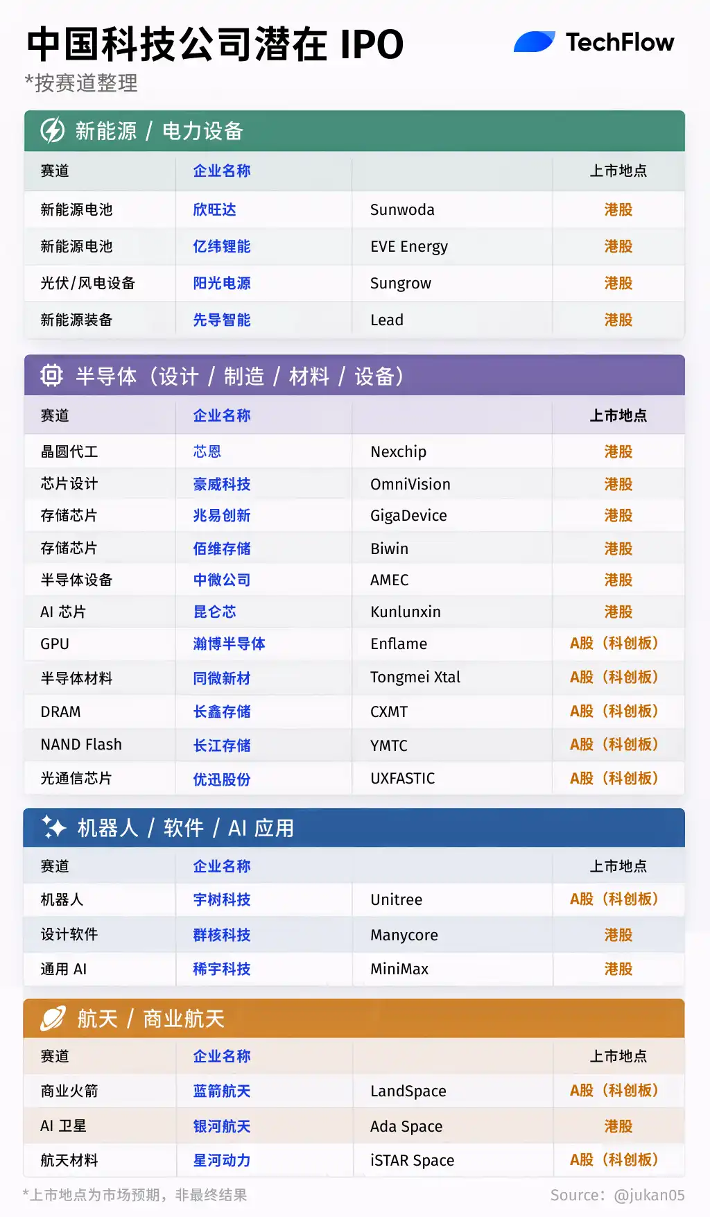 Enflame Technology adalah salah satu dari "Empat Naga Kecil" GPU domestik, juga sedang mengantre di STAR Market. Di sisi Bursa Hong Kong,昆仑芯 (perusahaan chip AI di bawah Baidu), OmniVision (sensor gambar), GigaDevice (chip memori, melantai di Bursa Hong Kong 13 Januari), Biwin Storage都有 tindakan. AMEC (pemimpin peralatan etching) juga akan melakukan listing sekunder di Bursa Hong Kong.