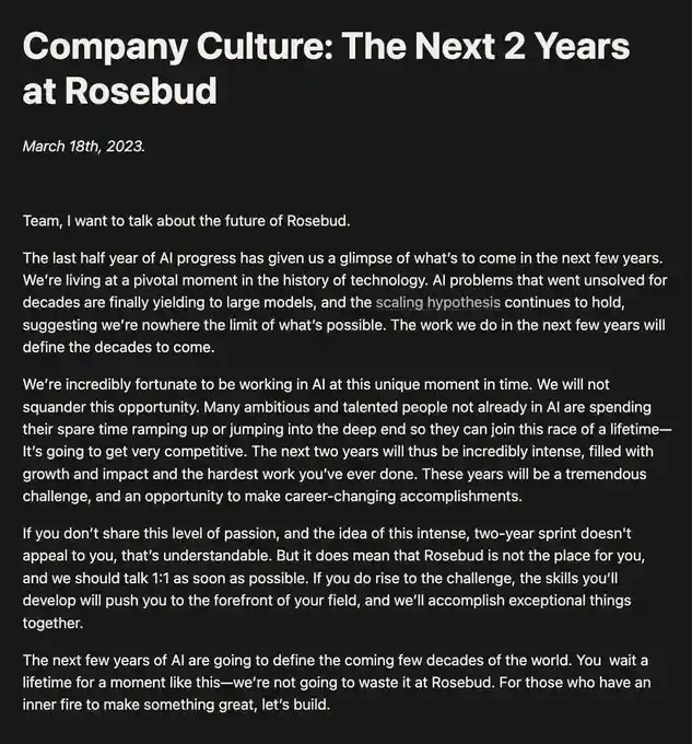 Awal 2023, memo internal penulis untuk tim, mencatat penilaian produk setelah terobosan kemampuan pembuatan kode. Inti dari surat internal ini adalah: AI sedang berada dalam jendela kunci yang akan menentukan puluhan tahun ke depan, dan dua tahun ke depan akan menjadi fase kompetisi yang sangat intens, ritme cepat, intensitas tinggi, eliminasi jelas. Perusahaan akan mengerahkan semua tenaga untuk "sprint" ini, hanya cocok untuk mereka yang memiliki dorongan internal yang kuat, bersedia menanggung tekanan tinggi dan berinvestasi jangka panjang—karena ini bukan hanya pengalaman kerja, tetapi lebih merupakan kesempatan bersejarah yang dapat mengubah lintasan karir individu.