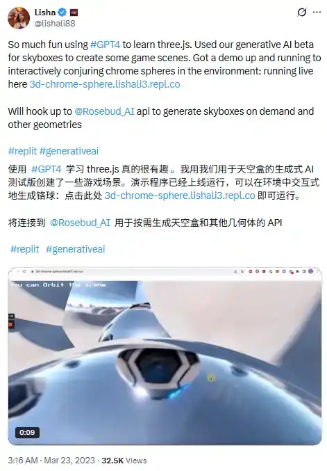 Tangkapan layar tweet 23 Maret 2023. Saya menggunakan GPT-4 untuk mempelajari Three.js, menggabungkan generative AI Rosebud untuk menghasilkan skybox, mendemonstrasikan prototipe awal memanggil adegan 3D melalui teks