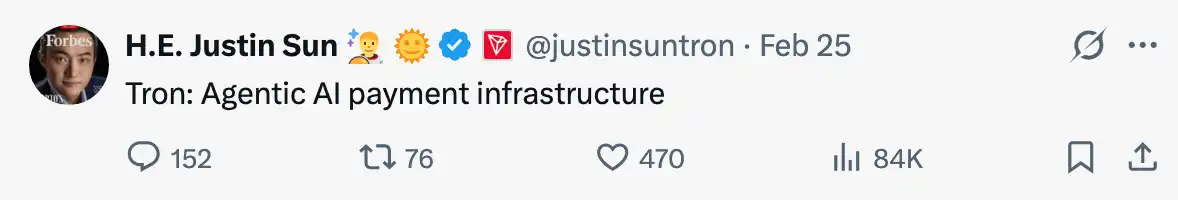 Seperti diketahui, jaringan TRON Network menampung volume peredaran USDT terbesar di dunia. Seperti disebutkan sebelumnya, inti dari Web4.0 adalah interaksi pembayaran antara mesin dan mesin, AI membutuhkan jaringan pembayaran dengan transfer cepat, biaya rendah, dan likuiditas yang sangat besar. Jaringan pembayaran USDT TRON sangat sesuai dengan kebutuhan keuangan dasar AI Agent. Justin Sun hanya perlu membangun satu set API pembayaran yang dapat dipanggil dengan mulus oleh AI di jaringan TRON, dan dia dapat terus menghasilkan uang dengan mudah di era Web 4.0.