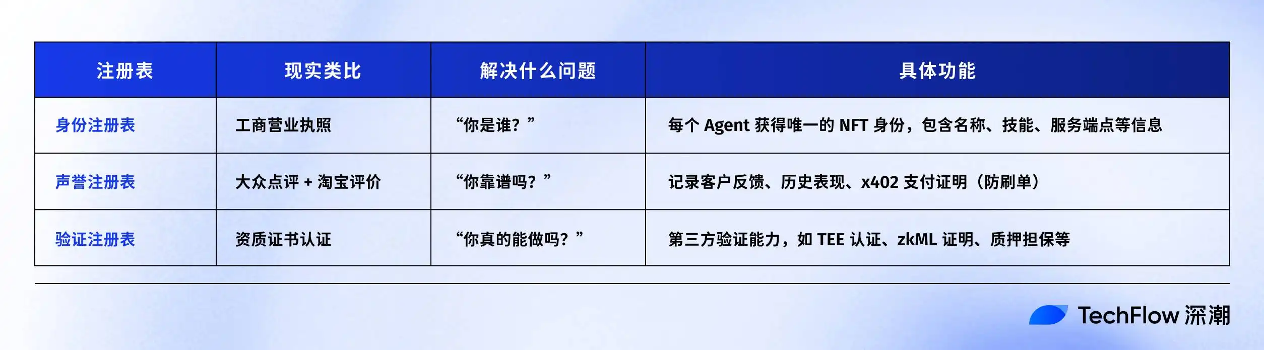Tiga buku ini digabungkan, menyelesaikan satu masalah: ketika dua AI Agent bertemu di chain, bagaimana cara mengetahui apakah pihak lain dapat dipercaya?