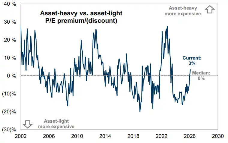 Data Goldman Sachs pada saat itu juga sama mengesankannya: sejak awal 2025, portofolio aset berat mereka (GSSTCAPI) telah mengungguli portofolio aset ringan (GSSTCAPL) sebesar 35%. Pada tingkat makro, suku bunga riil yang lebih tinggi, fragmentasi geopolitik, dan rekonfigurasi rantai pasokan, dianggap bersama-sama membentuk angin struktural yang mendukung saham aset berat.