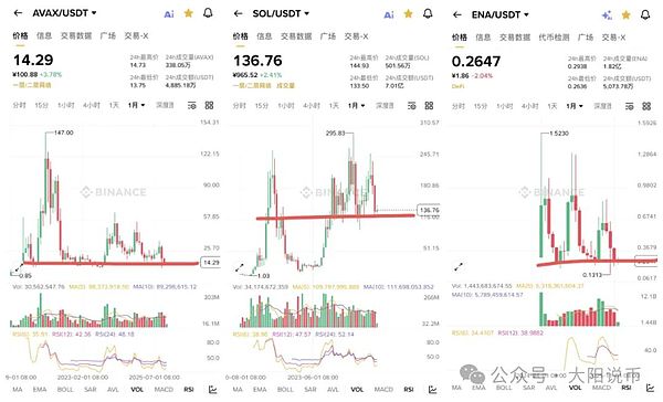 Dengan mengamati pergerakan bulanan SOL, AVAX, ENA dapat ditemukan bahwa mereka telah menyentuh level support kunci bulanan, ini masing-masing mewakili动向 koin mainstream, koin公链 lama, dan koin baru bull run ini, juga kurang lebih mencerminkan kondisi keseluruhan pasar altcoin saat ini.