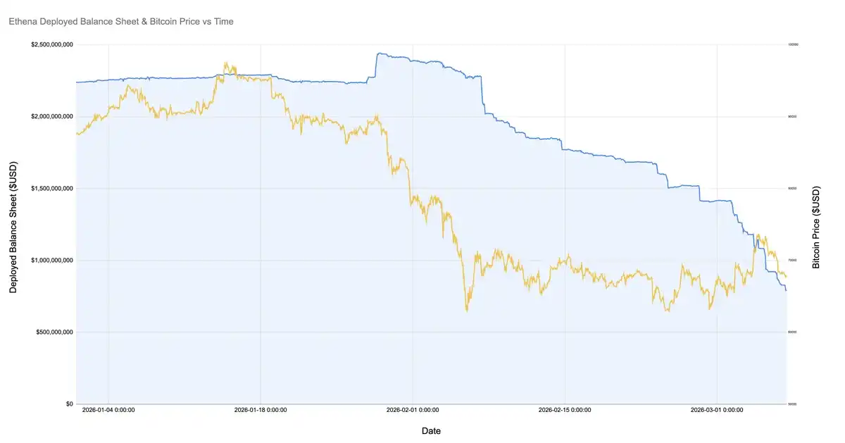 Gambar di bawah menunjukkan neraca yang diungkapkan oleh Ethena, di mana aset dibagi menjadi kas dan modal yang dikerahkan, rentang waktunya adalah dari 27 Desember 2024 hingga 7 Maret 2026.