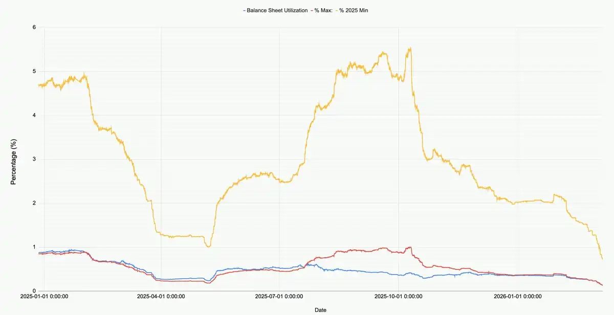Gambar di bawah menunjukkan perubahan modal yang dikerahkan dalam neraca Ethena relatif terhadap ukuran total, nilai terendah 2025, dan nilai tertinggi 2025.