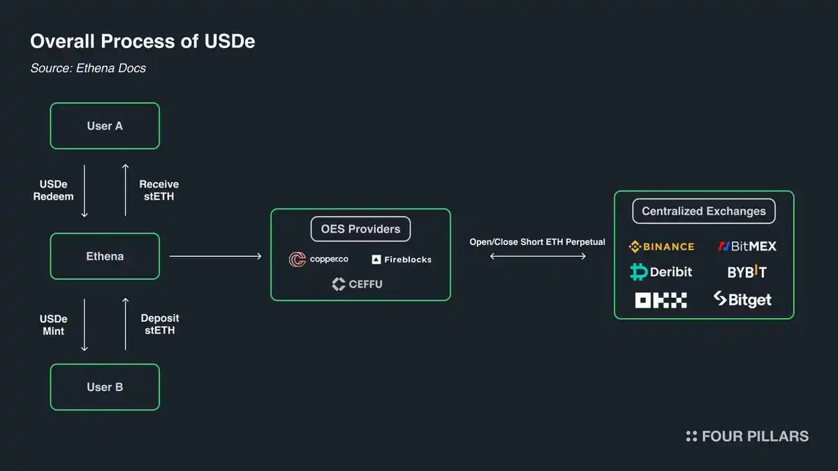 Dan Ethena memberikan kita jendela unik untuk mengamati pasar derivatif crypto. Seperti yang ditunjukkan pada gambar di bawah, strategi Ethena pada dasarnya adalah melakukan carry trade (perdagangan arbitrase) cryptocurrency, logikanya sangat sederhana — ketika seorang trader melakukan long aset crypto, Ethena akan menjadi pihak lawan dengan melakukan short. Pada saat yang sama, Ethena akan membeli aset dalam jumlah yang setara di pasar spot untuk melindungi nilai (hedge) posisi short-nya.