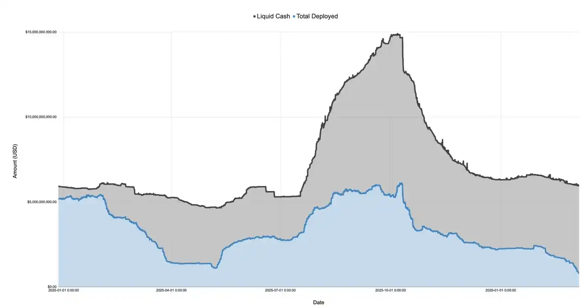Perlu dicatat, selama keruntuhan pasar di mana Bitcoin jatuh ke $60.000, Ethena masih mengerahkan modal lebih dari $2 miliar. Dan hanya satu bulan kemudian, setelah 8 Februari 2026, modal yang dikerahkan turun drastis 60%.