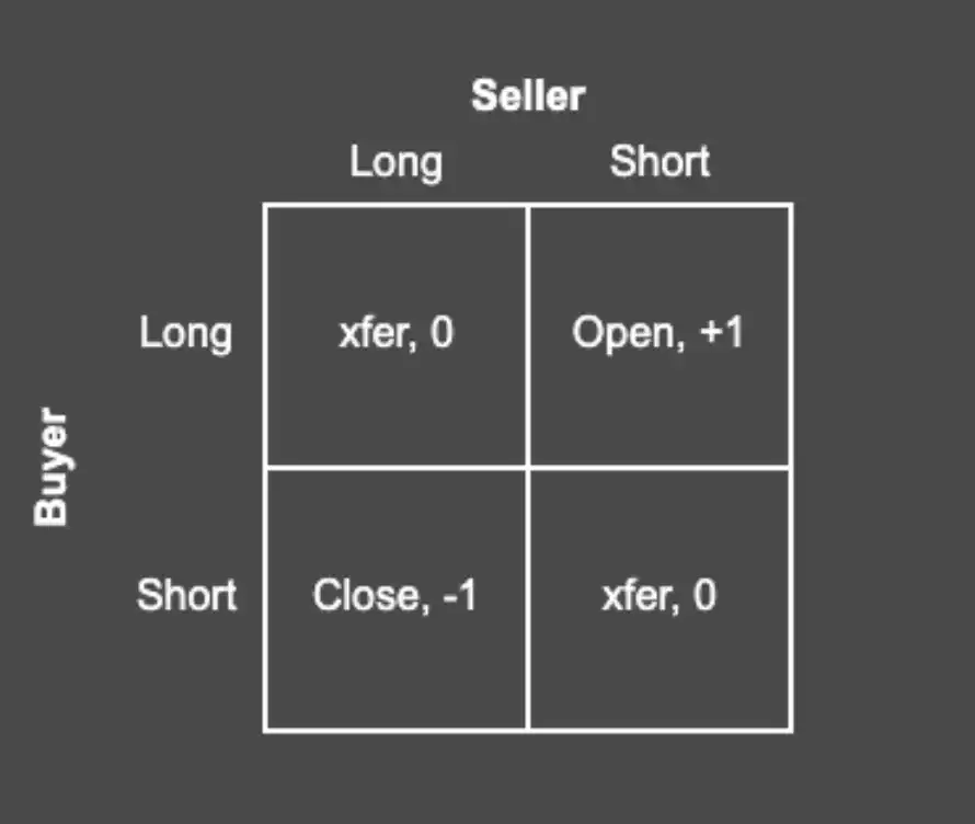 Setiap transaksi memiliki pembeli dan penjual. Ketika pembeli dan penjual suatu kontrak sama-sama long atau sama-sama short, bursa hanya perlu mentransfer kepemilikan kontrak antara kedua belah pihak. Transfer ini tidak menciptakan atau memusnahkan kontrak apa pun. Ketika pembeli adalah long dan penjual adalah short, sebuah kontrak baru harus dibuat, pembeli mendapatkan posisi long, penjual mendapatkan posisi short, sehingga meningkatkan open interest sebanyak 1. Sebaliknya, jika penjual adalah long dan pembeli adalah short, bursa dapat melepaskan ikatan kedua belah pihak dengan suatu kontrak dan menghapus kontrak tersebut, sehingga mengurangi open interest sebanyak 1.