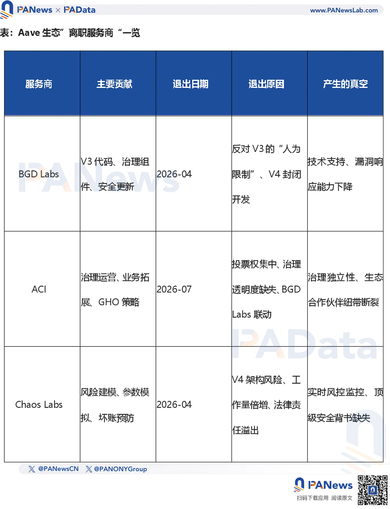 Dari kepergian pilar teknis BGD Labs yang teguh, hingga perpecahan terbuka dari pelopor tata kelola ACI (Aave Chan Initiative), dan hingga pemutusan hubungan resmi dari pengelola risiko Chaos Labs, sebuah "penarikan besar-besaran" penyedia layanan sedang berlangsung.