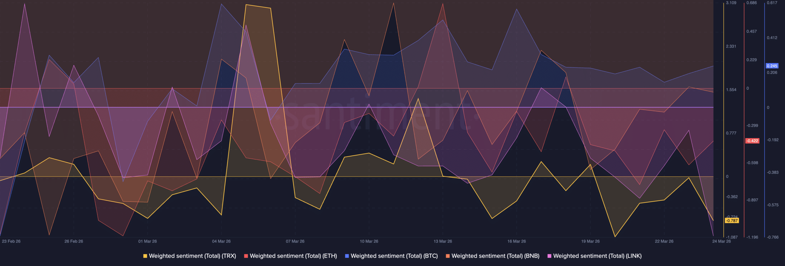 Ini lebih lanjut dikonfirmasi oleh analisis Weighted Sentiment Santiment. Grafik dengan jelas menunjukkan bahwa Bitcoin adalah satu-satunya token dengan Weighted Sentiment positif, sedangkan altcoin lainnya berada di bawah tanda level 50 di zona negatif.