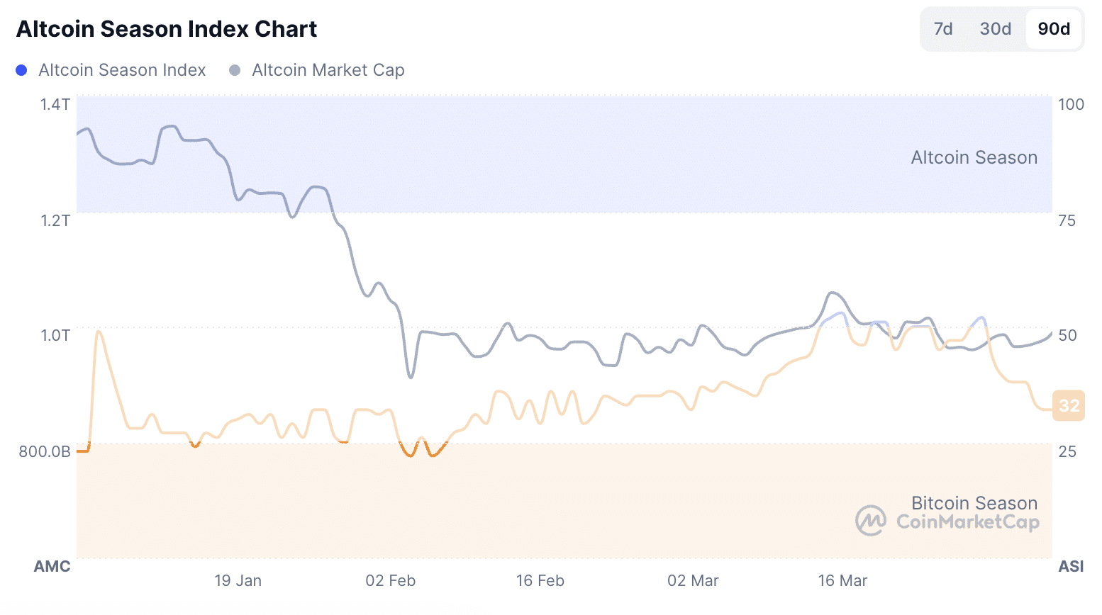 Indeks Altcoin CoinMarketCap, yang berada di angka 32 pada saat pelaporan, lebih lanjut menunjukkan bahwa musim Bitcoin masih berlangsung.
