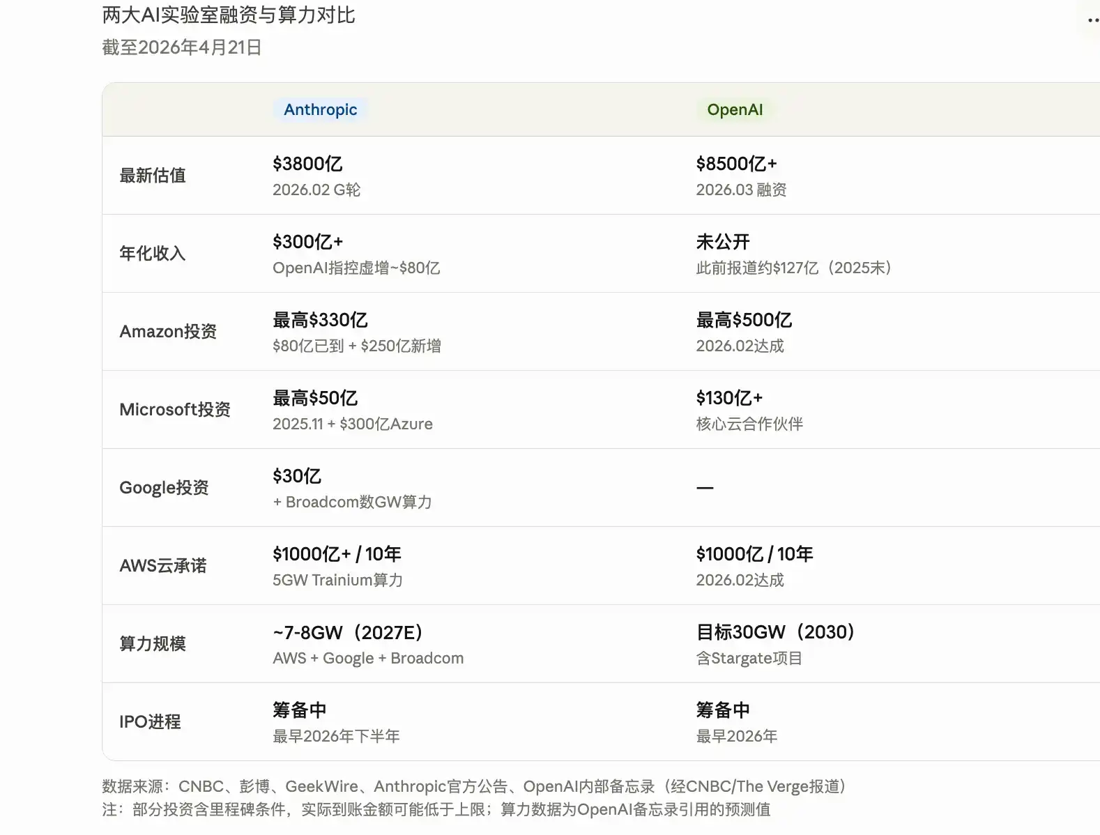 Dua perusahaan AI besar juga bersaing untuk membuktikan kekuatan mereka kepada investor. Menurut CNBC, Anthropic dan OpenAI sama-sama mempersiapkan diri untuk kemungkinan IPO yang bisa terjadi paling cepat tahun ini. Valuasi putaran pendanaan terbaru OpenAI lebih dari $850 miliar, sementara Anthropic $380 miliar. Anthropic menyebut pendapatan tahunannya telah melampaui $30 miliar (pada akhir 2025 sekitar $9 miliar), sementara OpenAI dalam memo menuduh angka ini digelembungkan sekitar $8 miliar, dengan alasan Anthropic memasukkan pendapatan kerjasama cloud dengan Amazon dan Google sebagai jumlah kotor (gross) bukan bersih (net).