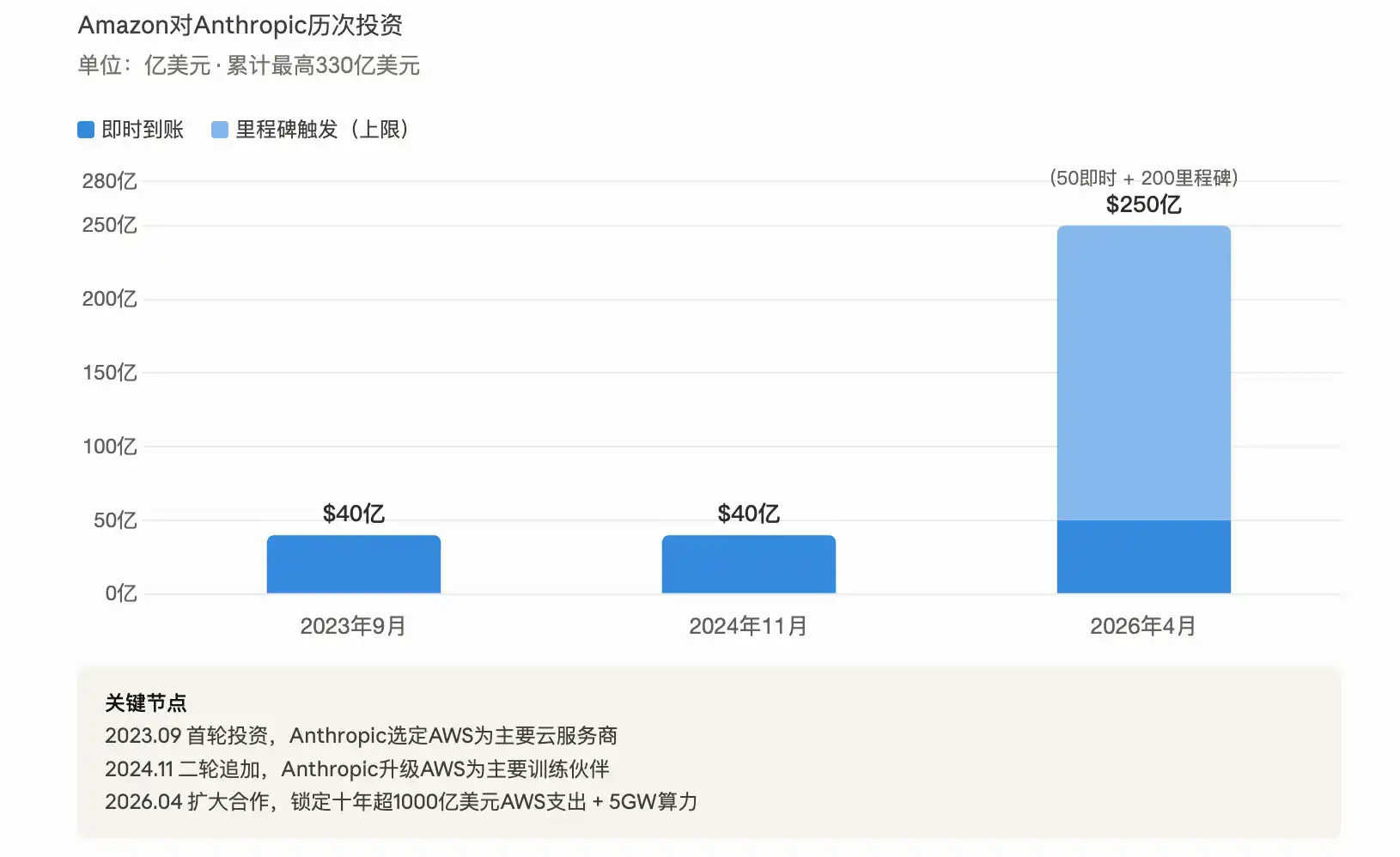 Menurut laporan dari CNBC, Bloomberg, dan banyak media lainnya pada tanggal 20 April, Amazon mengumumkan investasi tambahan hingga $25 miliar ke Anthropic, dengan $5 miliar langsung dicairkan, dan sisanya $20 miliar dikaitkan dengan pencapaian tonggak bisnis tertentu. Investasi ini dieksekusi berdasarkan valuasi $380 miliar Anthropic pada putaran pendanaan Seri G bulan Februari lalu. Ditambah dengan investasi kumulatif sebelumnya sebesar $8 miliar, komitmen investasi total Amazon untuk Anthropic kini telah mencapai batas atas $33 miliar.