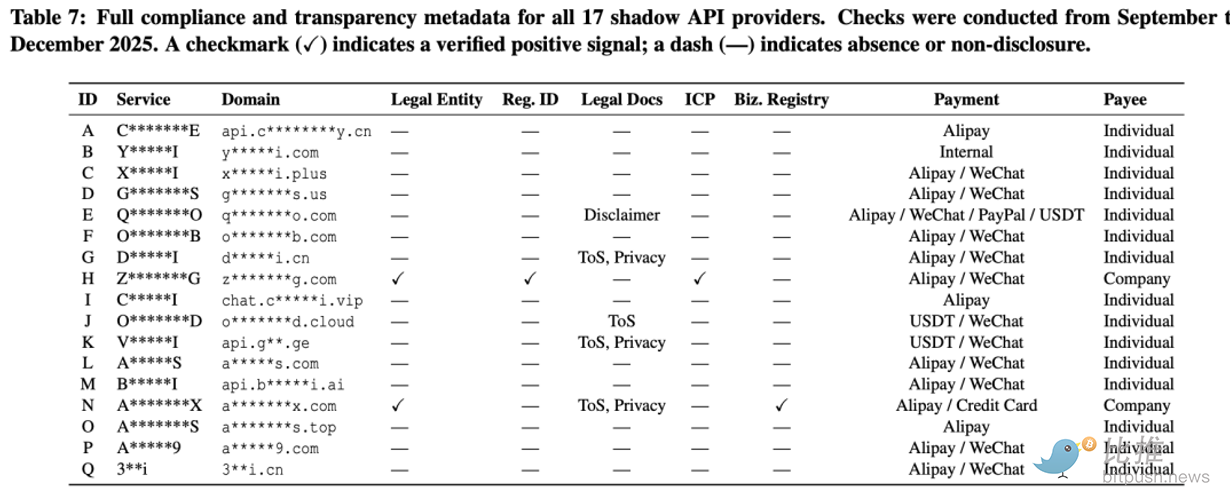 Dari 17 penyedia layanan API bayangan independen teratas yang diidentifikasi oleh audit CISPA, 15 dioperasikan murni oleh individu, lebih dari 88,2% penyedia bahkan tidak memiliki pendaftaran Penyedia Konten Internet (ICP) paling dasar.
