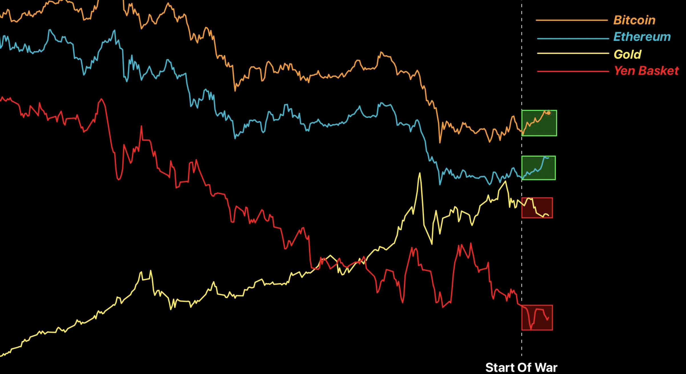 Tetapi pergeseran yang lebih penting adalah bagaimana pasar bereaksi terhadap ketidakpastian. Secara tradisional, emas dan yen akan naik selama ketegangan geopolitik, tetapi baru-baru ini mereka justru turun, sementara Bitcoin dan Ethereum [ETH] mengalami kenaikan.