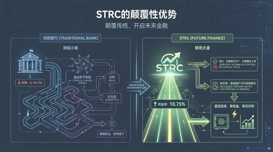 STRC adalah mesin keuangan pertama di dunia yang memenuhi persyaratan regulasi, dengan Bitcoin sebagai agunan. Apa artinya? Ini berarti nasabah biasa sekarang dapat membeli produk yang didukung Bitcoin dan menghasilkan imbal hasil, secara terbuka dan legal, di akun pialang mereka. Anda tidak perlu membuka rekening bank, atau terlibat dalam sistem perbankan bayangan yang kompleks. Yang lebih mencolok, imbal hasil STRC saat ini bisa mencapai 10,75%, sedangkan bunga tabungan bank tradisional biasanya hanya antara 0,1% hingga 1%, membentuk kontras yang鲜明.