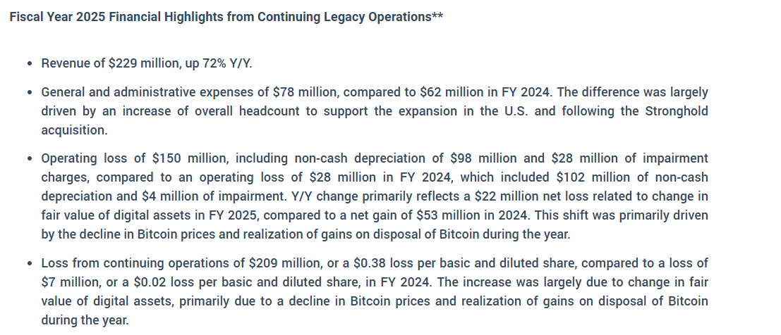 APendapatan meningkat karena ekspansi hashrate yang meningkatkan output, namun kerugian melebar akibat tekanan akuntansi termasuk depresiasi $98 juta, impairment $28 juta, dan fluktuasi harga BTC $22 juta, ditambah hashprice yang turun memangkas margin.