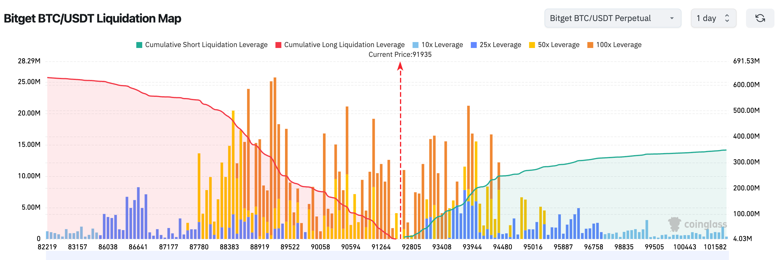 3. Peta Likuidasi Bitget BTC/USDT menunjukkan: Di dekat harga BTC saat ini (sekitar $92.000), di atasnya terakumulasi banyak posisi leverage short, sekali tembus, akan memicu further short squeeze; di bawahnya, area likuidasi long yang terakumulasi cukup padat, menunjukkan bahwa jika harga turun ke kisaran $88.000 ~ $90.000, akan memicu risiko likuidasi long yang signifikan.