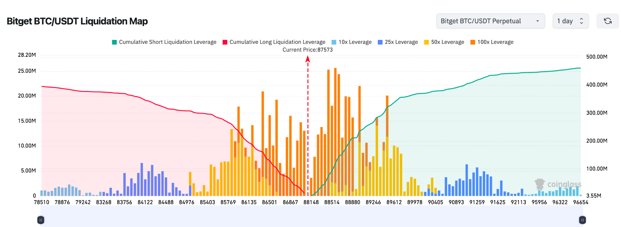 3. Peta likuidasi Bitget BTC/USDT menunjukkan: Harga saat ini sekitar 87,5k berada tepat di titik pemisah likuidasi long-short, di atas interval 88k–90k terdapat penumpukan besar posisi long leverage 50x–100x, sekali tembus dengan volume tinggi, mudah memicu kenaikan cepat akibat squeeze long. Di bawah area 85k–86k, likuidasi short dan support relatif lemah, jika terjadi fake breakout dan penurunan, harga mungkin turun cepat, secara keseluruhan menunjukkan struktur "long crowded, volatilitas membesar, mudah diburu".